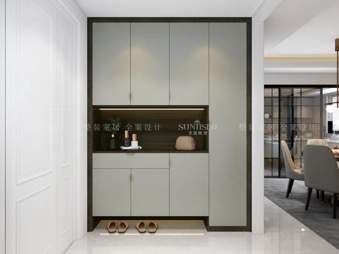 玄關(guān)吸納了極簡(jiǎn)精華,采用極簡(jiǎn)線(xiàn)條將入戶(hù)玄關(guān)模塊化分割,完成了一場(chǎng)精簡(jiǎn)入戶(hù)的儀式感。煙熏色與淺灰色彩有序排列出一個(gè)個(gè)性的極簡(jiǎn)入戶(hù)空間。