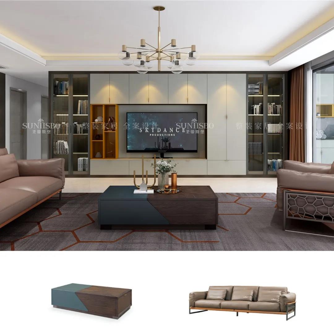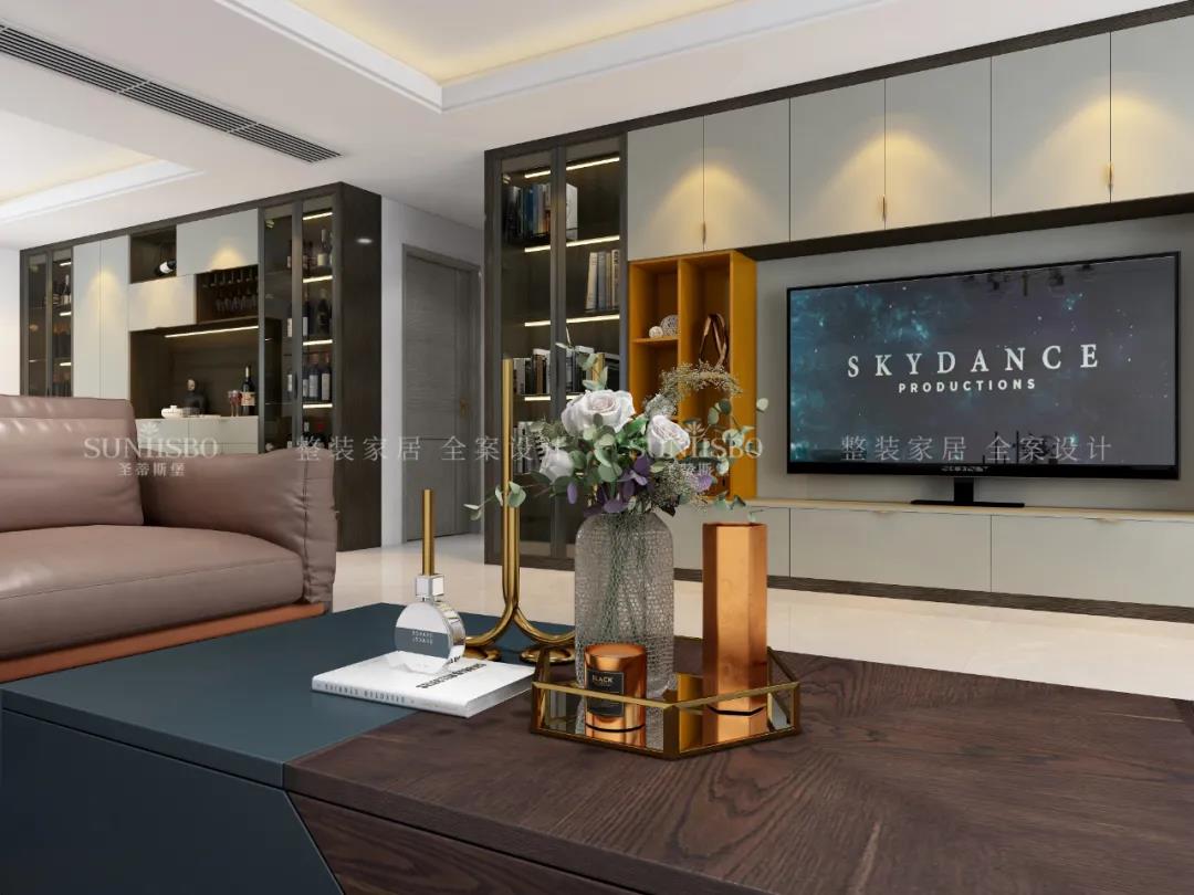 客廳一面置頂的定制柜,大大增加了空間收納,也將電視背景墻的觀(guān)賞性發(fā)揮到極致。淺灰與明亮橙的“動(dòng)靜”屬性,與沙發(fā)上的愛(ài)馬仕橙相呼應,從空間中漫溢出歡樂(lè )和跳動(dòng)的樂(lè )章,回響生活中那一抹絢麗和精致,同時(shí)也擁有著(zhù)對立且和諧的高級范兒。