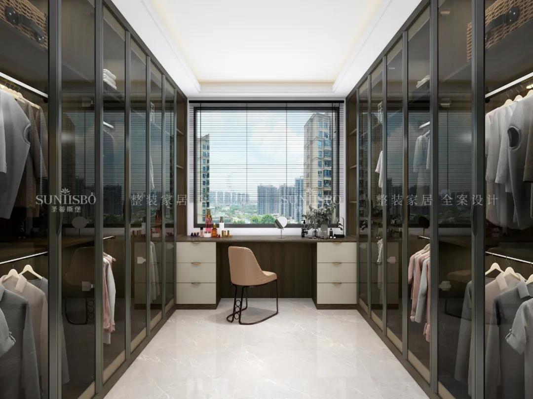 家的質(zhì)感,并不是用瑣碎的東西堆砌而成的,衣帽間是品質(zhì)生活的一個(gè)重要的指標。這套衣帽間是以平行的格局設計成步入式空間,全開(kāi)放式的呈現,金屬與透明玻璃材質(zhì)的糅合,襯托出柜體高級奢華的質(zhì)感。